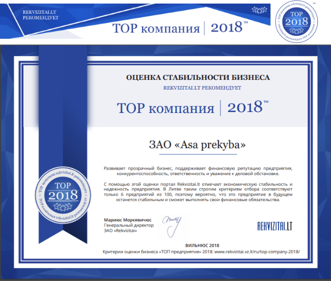 ЗАО «ASA Транспорт – Прекиба» было признано ТОП-предприятием – прозрачным бизнес-разработчиком, компанией, которая продвигает финансовую репутацию и ответственность компании и уважает деловую среду.